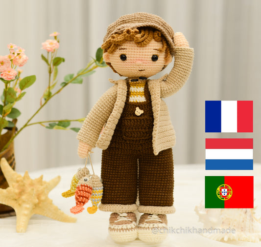 Crochet Doll Pattern Amigurumi, TOMMY The Fisher, PDF in English, French, Dutch, Portuguese