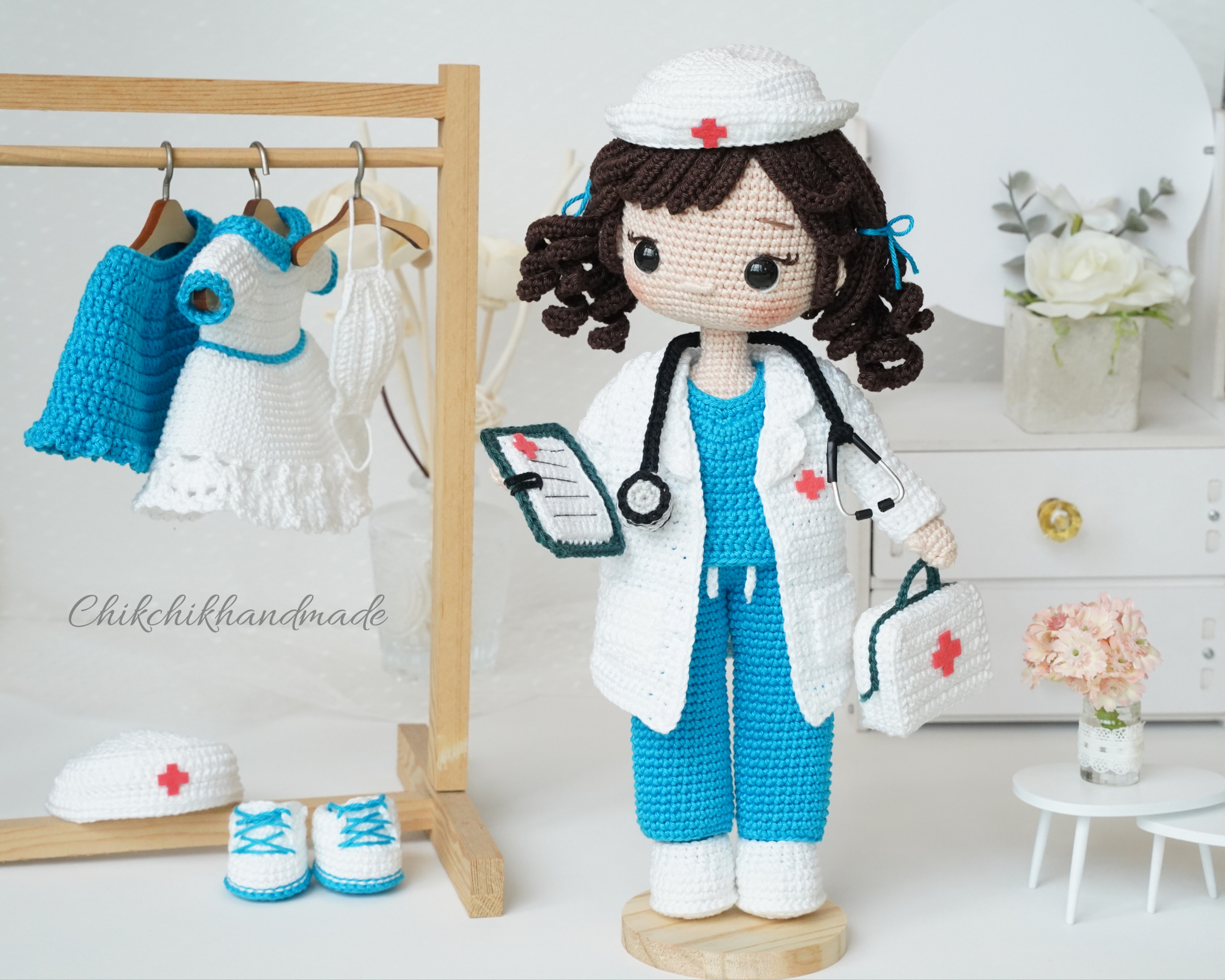 HELEN the Nurse is a sweet and caring crochet doll pattern that brings warmth, kindness, and a gentle touch of healing. With her fresh and youthful nurse outfit, plus a complete set of clothes that can transform her into a doctor, she offers both grace and versatility.